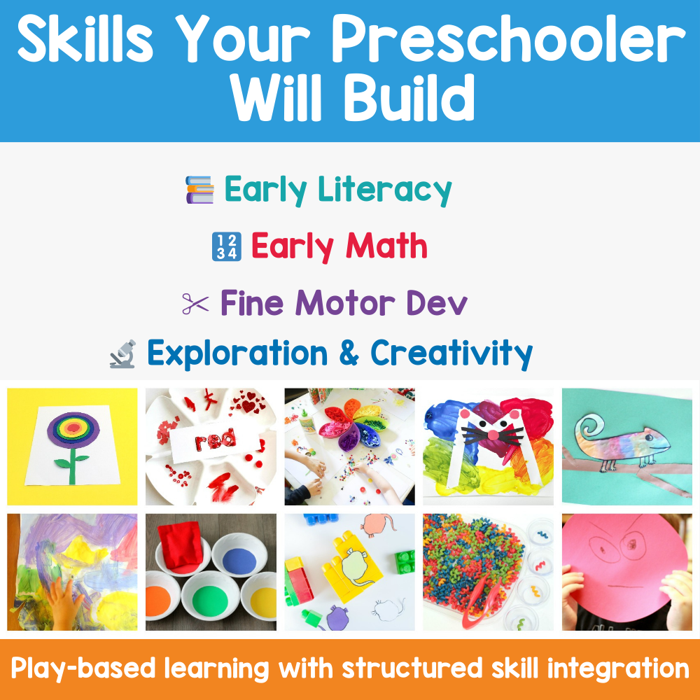 Inside the download you will find 24 interactive preschool learning activities that explore colors through play and creative exploration.